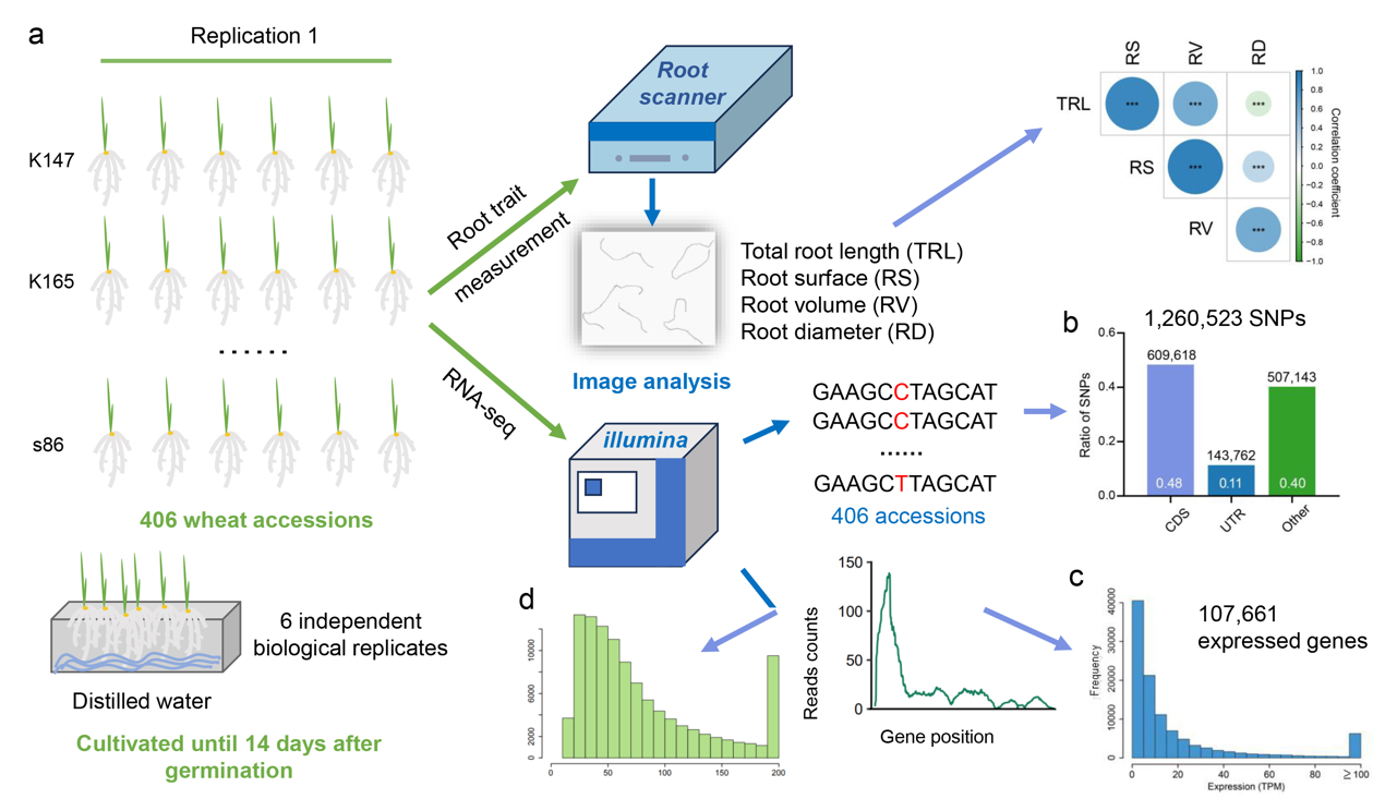 The Green Revolution (GR) dramatically increased the yield of bread wheat (Triticum aestivum L.); however, whether and how GR reshaped the wheat root system remains largely unknown. Here, a large-scale transcriptomic and phenotypic investigation was performed on seedling roots of 406 worldwide bread wheat accessions, and this analysis revealed differences in the transcriptomes and phenotypes between landraces and modern cultivars. The GR allele Reduced height (Rht)-D1b was the main genetic factor driving this phenotypic diversity, and it conferred a significantly larger seedling root to modern cultivars by increasing cell length and root meristem size. In this case, the translational reinitiation of TaRht-D1 underlies the genetic effects of Rht-D1b. In contrast, another GR allele, Rht-B1b, has no significant effect on root-related traits, although both alleles have similar genetic effects on reducing plant height. This unexpected effect of Rht-D1b on root systems, coupled with its effect on plant height, contributes to a substantially larger root-shoot ratio in modern wheat cultivars. These findings reveal previously overlooked benefits of GR alleles in modern wheat cultivars and provide clues for their future application in enhancing the seminal root system.