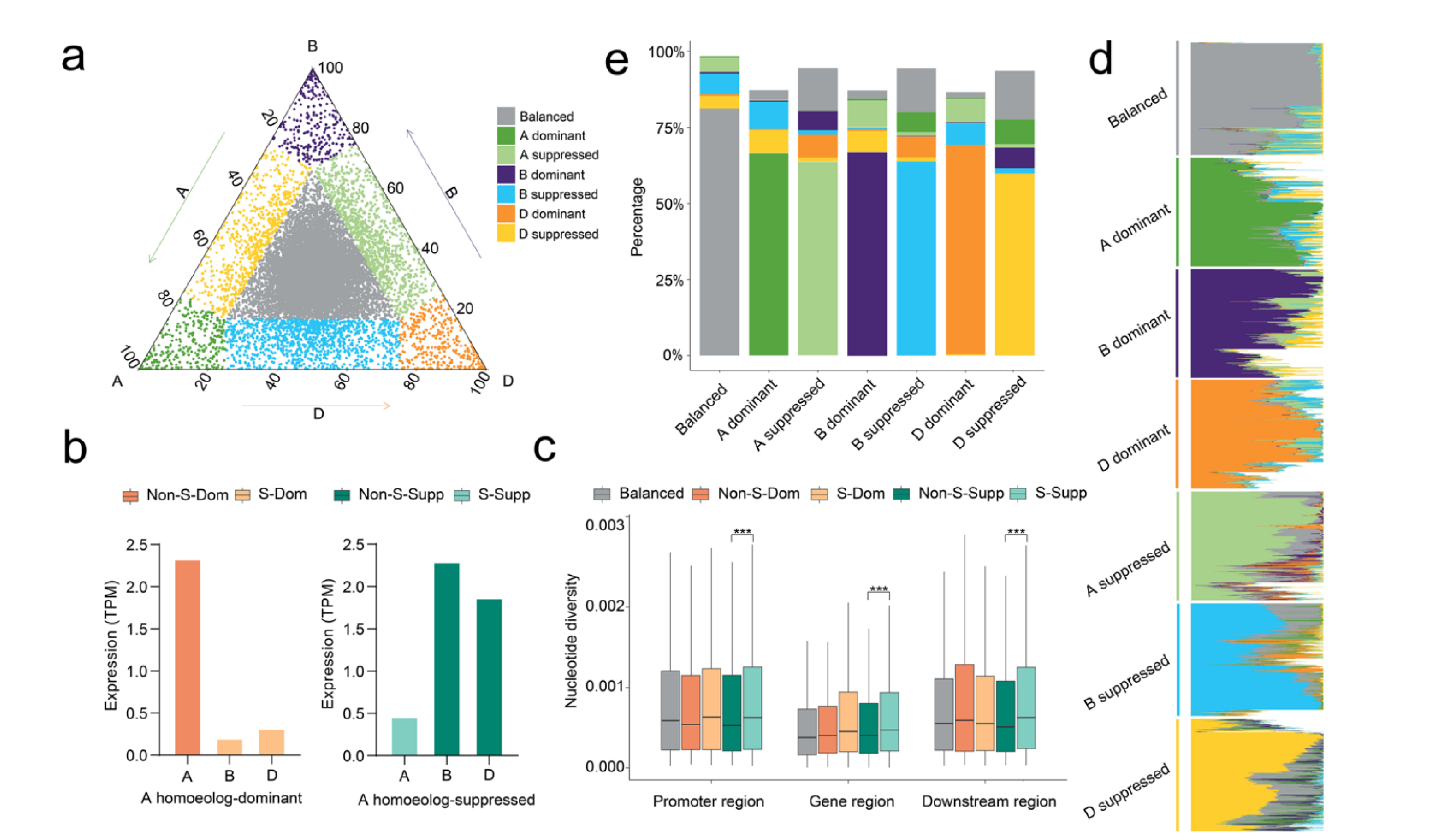 Here we uncover substantial variation in homoeolog expression bias among the root transcriptomes of a natural population of 406 bread wheat (Triticum aestivum ssp. aestivum) accessions collected worldwide. We develop a new model allowing us to identify 14,727 quantitative trait loci regulating the variation in homoeolog expression bias (hebQTLs), indicating that homoeolog expression bias is genetically regulated and can be predicted using genotyping data. The hebQTLs mostly regulate the expression of homoeologs in the same subgenome and downregulate expression to produce homoeolog expression bias, suggesting that intra-subgenomic rather than inter-subgenomic interactions induce homoeolog expression bias. Furthermore, we determine that hebQTL-regulated homoeologs exhibit higher genetic diversity and weaker biological functions than their counterparts. Notably, the downregulation of 38.4% of hebQTL-regulated homoeologs is compensated for by the upregulation of other homoeologs within the triad.