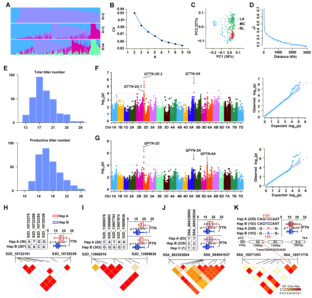 Tiller number is a key factor influencing wheat plant architecture and yield potential. This study analyzed the variation in tiller number among 323 wheat accessions across nine environmental conditions. The results revealed a significant decrease in tiller number in modern cultivars compared to traditional landraces, indicating a trend in selective breeding for fewer tillers. Genome-wide association studies (GWASs) identified four quantitative trait loci (QTLs) associated with tiller number on chromosomes 2D, 5A, and 6A. Haplotypes linked to reduced tiller number at three of these QTLs have been significantly selected and are predominantly found in various Chinese agroecological zones, positively affecting grain number and/or weight. These findings suggest that contemporary Chinese wheat breeding strategies have prioritized reducing tiller number while improving spike yield. Identifying selected haplotype combinations can further enhance breeding efforts aimed at optimizing the tiller number trait. This study provides insights into the genetic basis of tiller number QTLs and their relevance to wheat breeding practices.